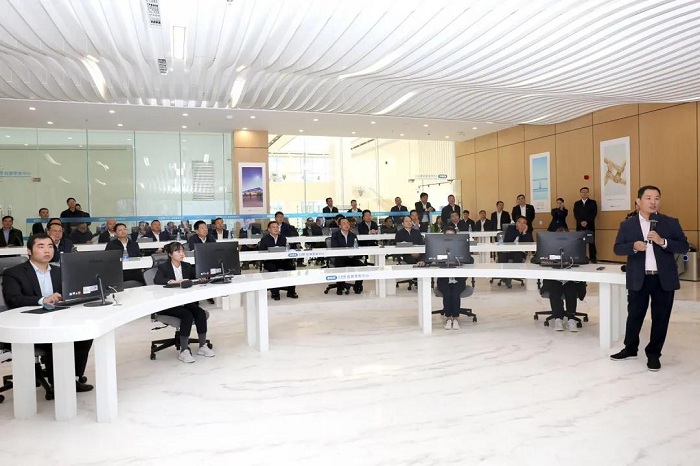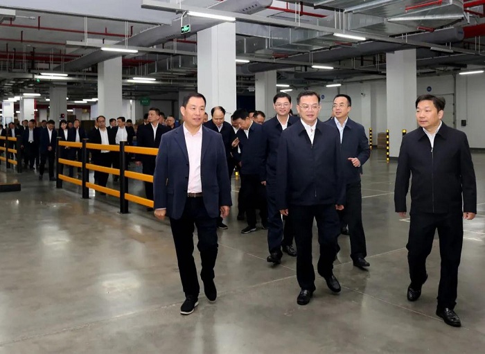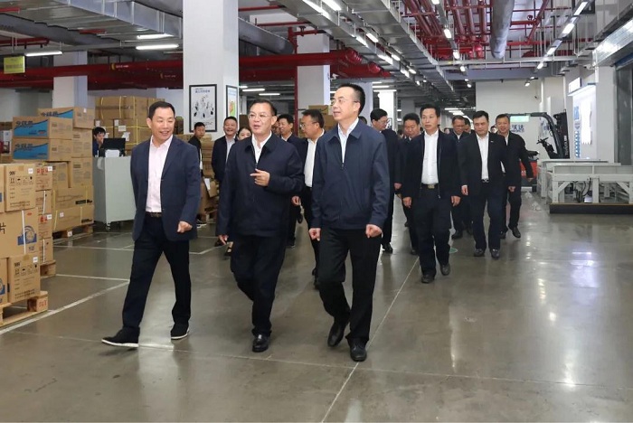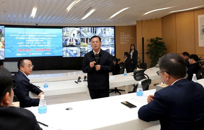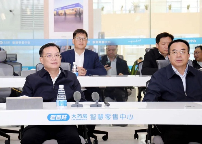長沙經(jīng)開區(qū)黨工委書記、長沙縣委書記、長沙高鐵新城黨工委書記沈裕謀(左一)率黨政代表團參觀老百姓大藥房智慧零售中心